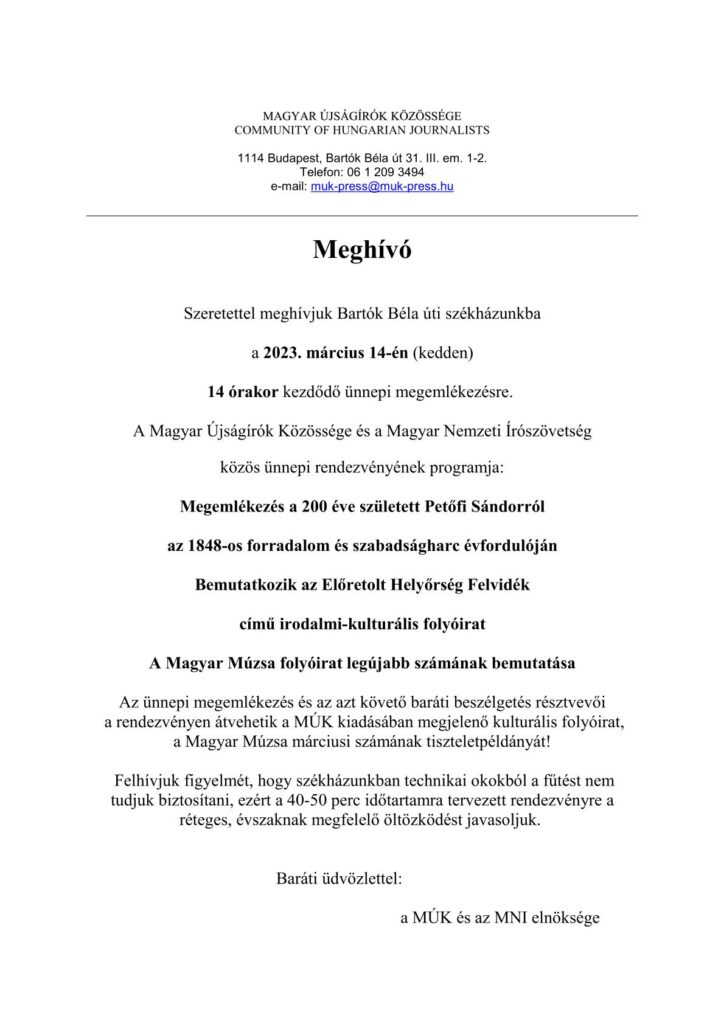Meghívó Bartók Béla úti székházunkba a március 14-ei ünnepi megemlékezésre és folyóirat bemutatóra